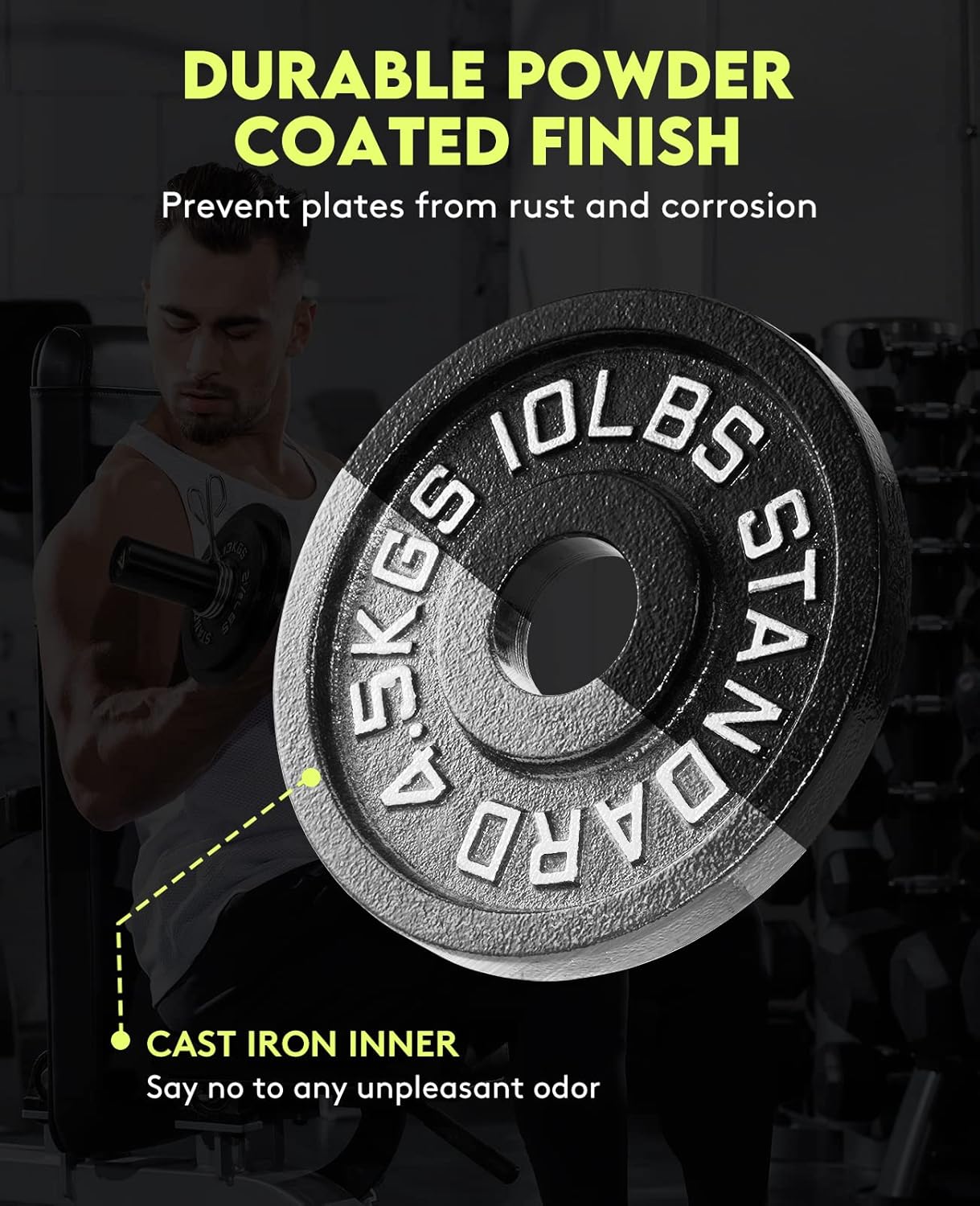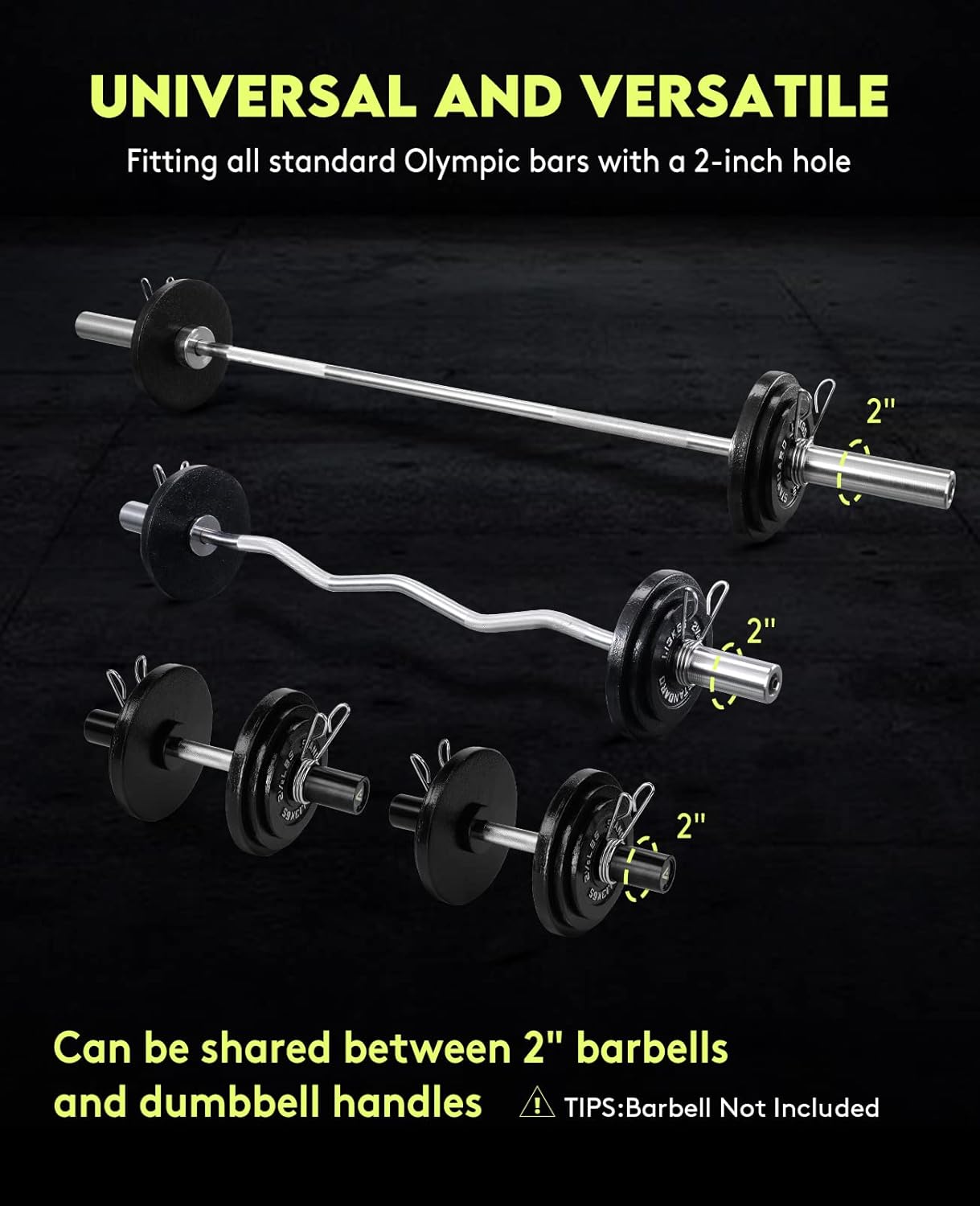 The 2-inch center hole on these weights ensures a snug fit against your Olympic bars or 2” dumbbell bars, providing a safer and more controlled workout experience. This feature is particularly useful for exercises like barbell squats, bench presses, and more.