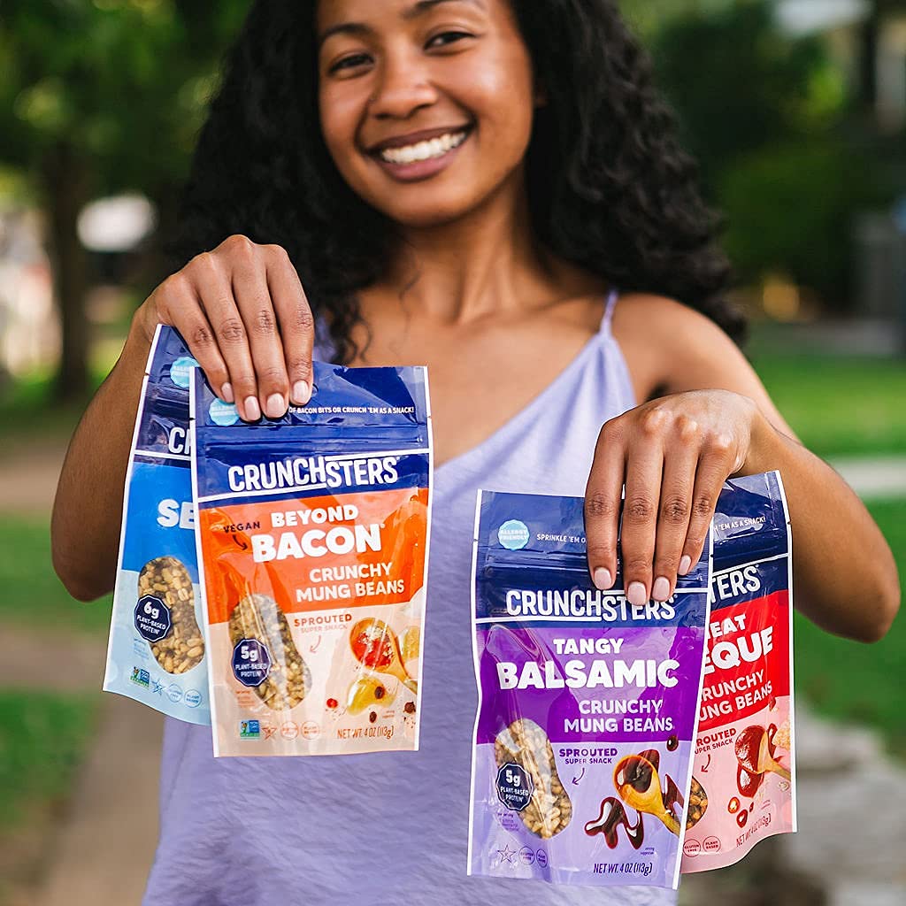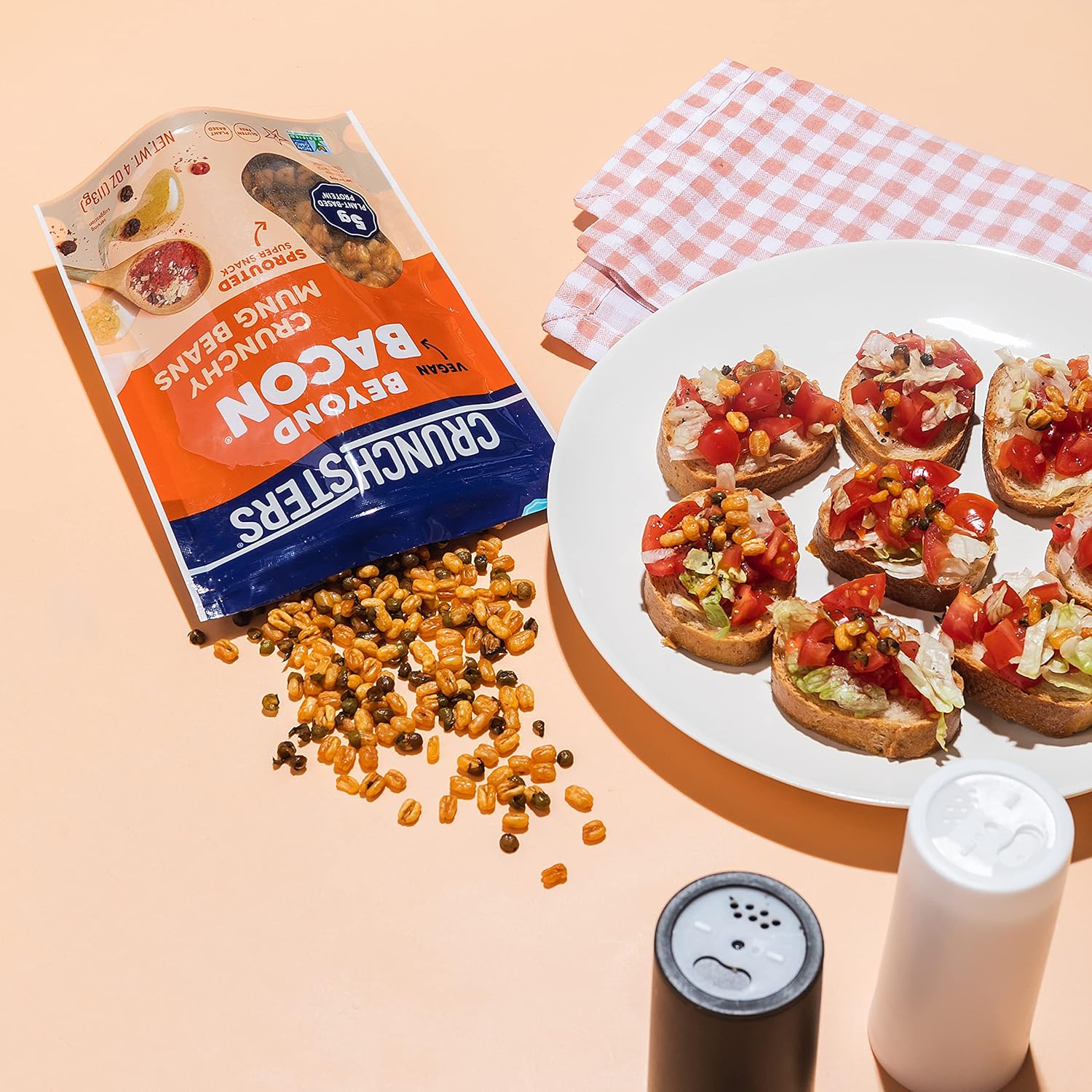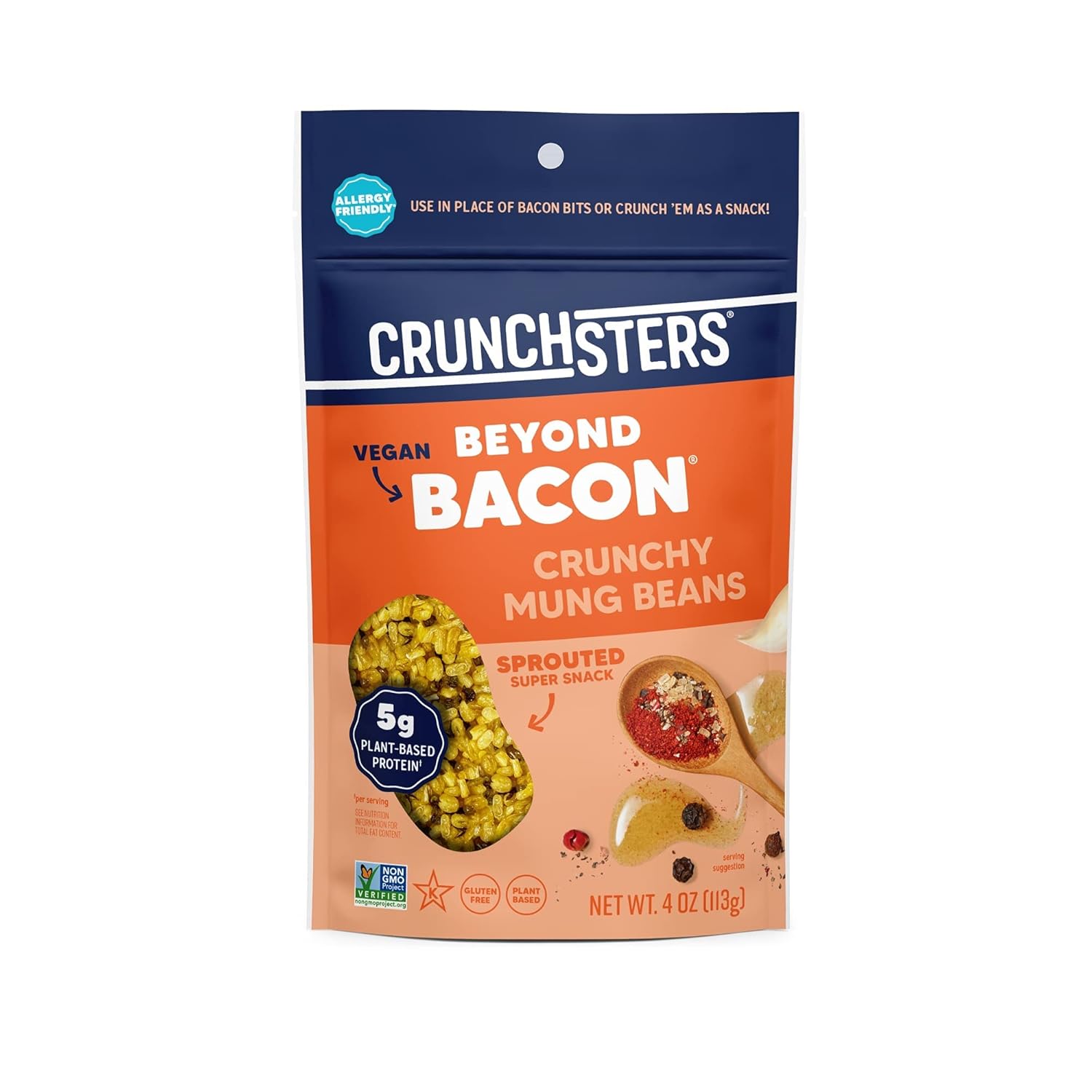 Crunchsters Sprouted Mung Beans, Plant-Based Protein Super-Snack and Salad Topper, Gluten-Free, Nut-Free, Vegan, 5g Protein/Serving, 4oz. Bags, Beyond Bacon, 6-Pack