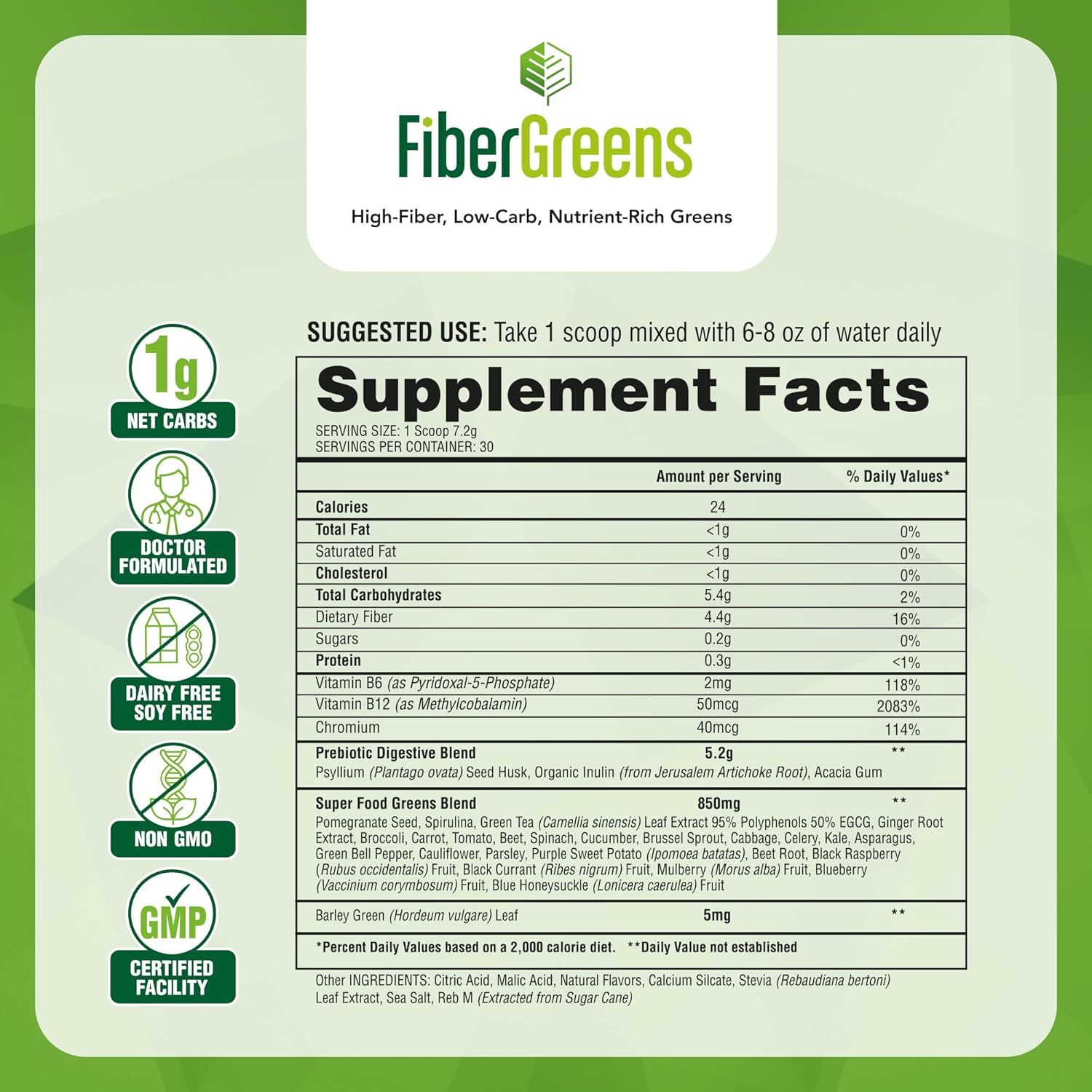 Take 1 scoop of Fiber Greens mixed with 6-8 oz of water daily.