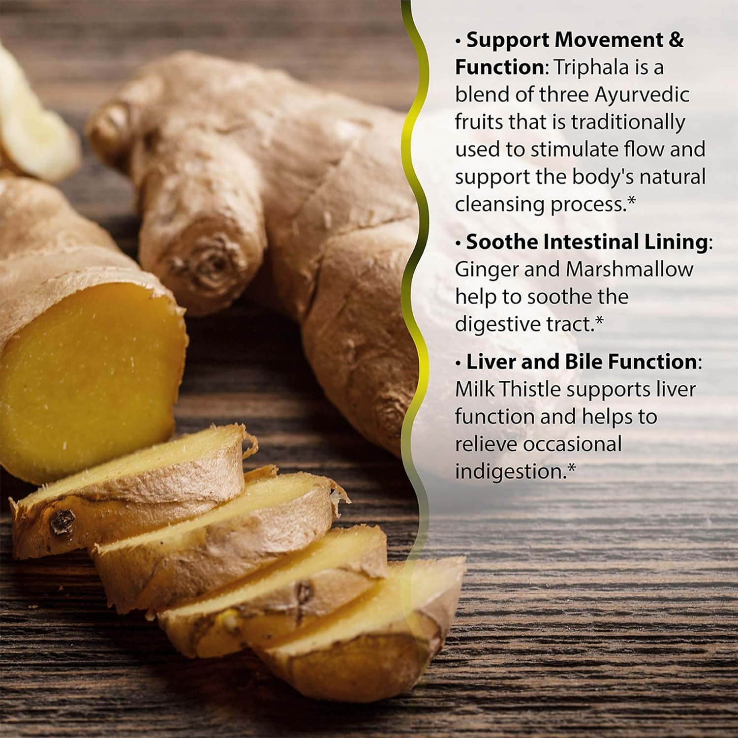 SOOTHE INDIGESTION – Ginger and marshmallow help to soothe the digestive tract. Milk Thistle supports liver function and helps to relieve occasional indigestion.