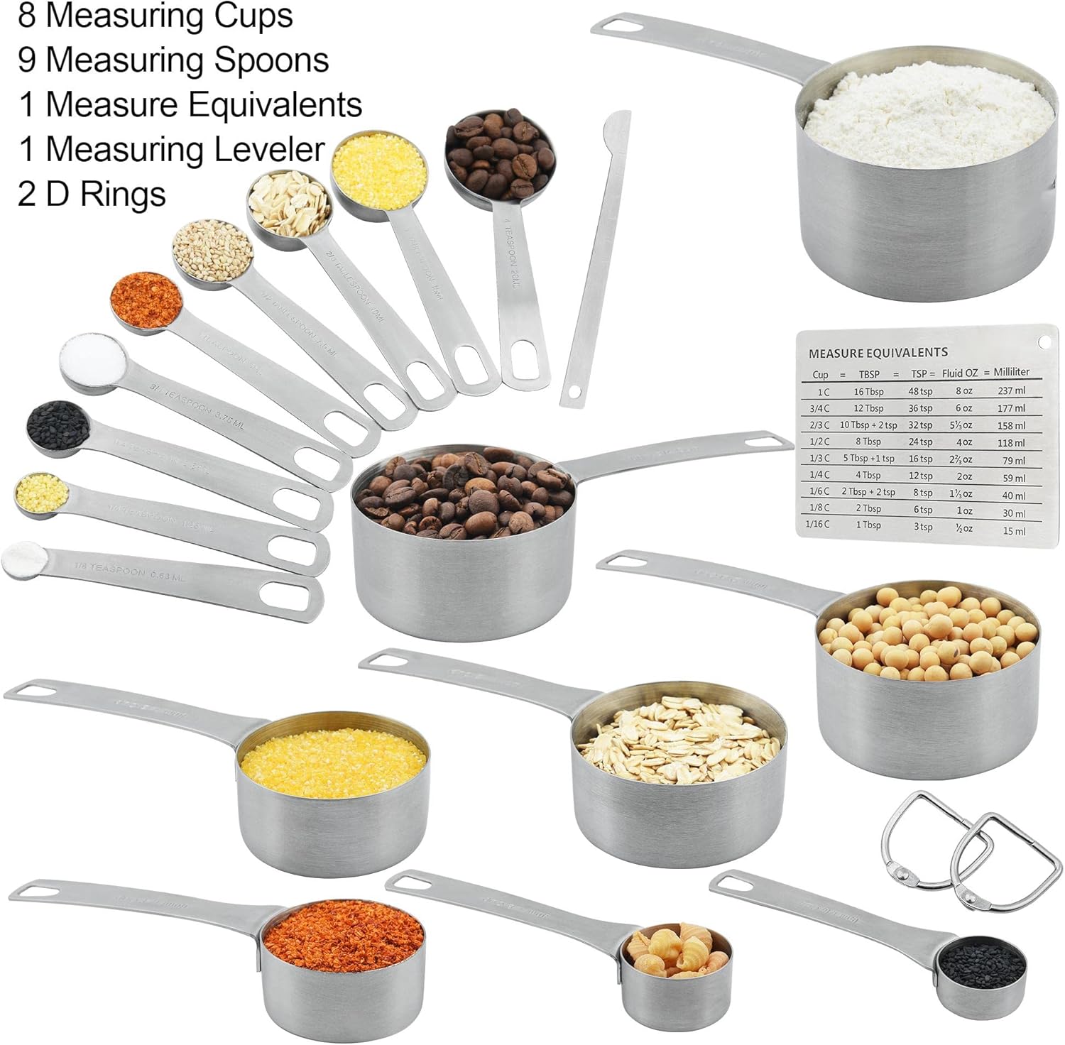 The set includes 19 pieces: 8 measuring cups, 9 measuring spoons, 1 equivalent, and 1 leveler.