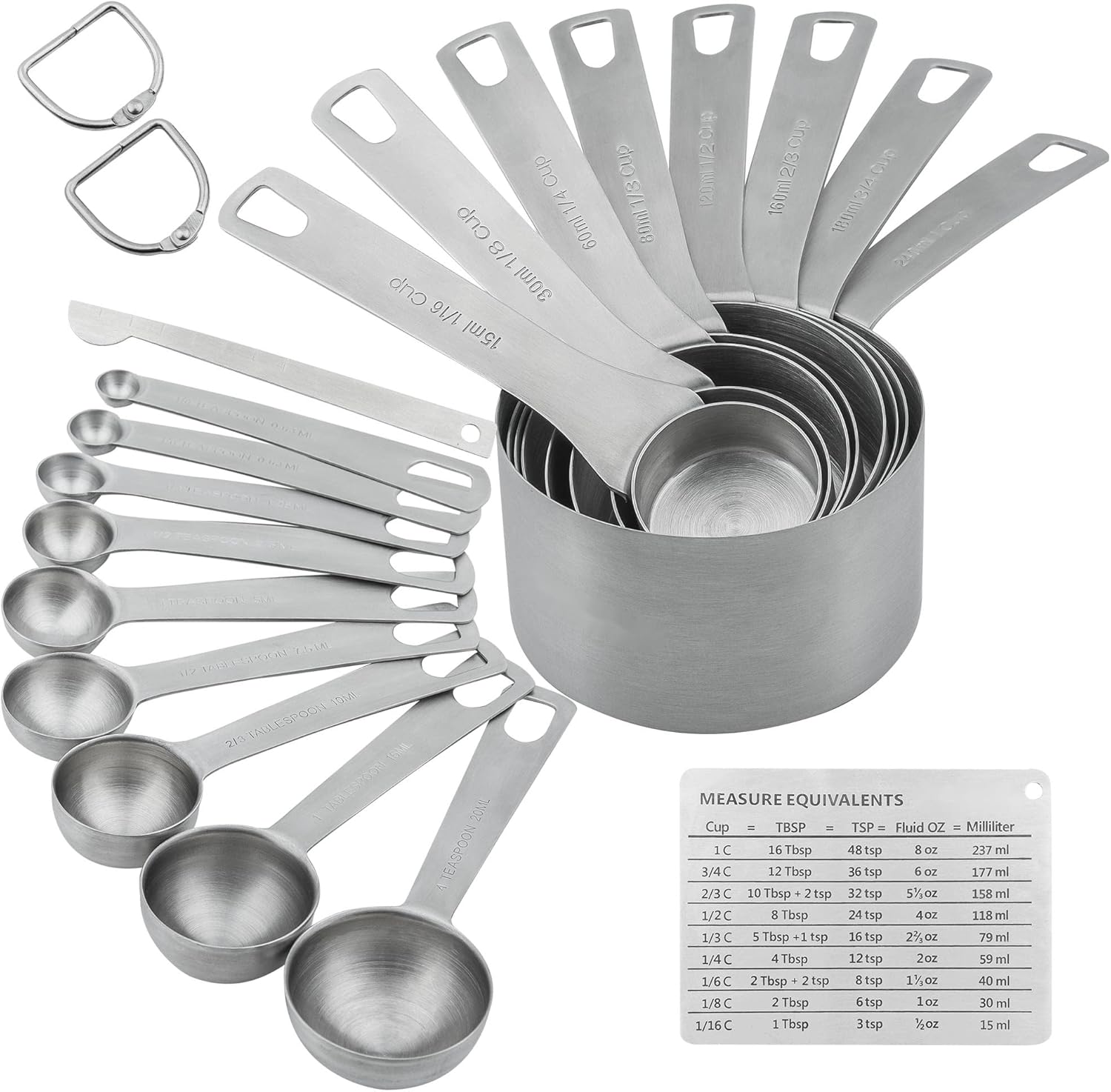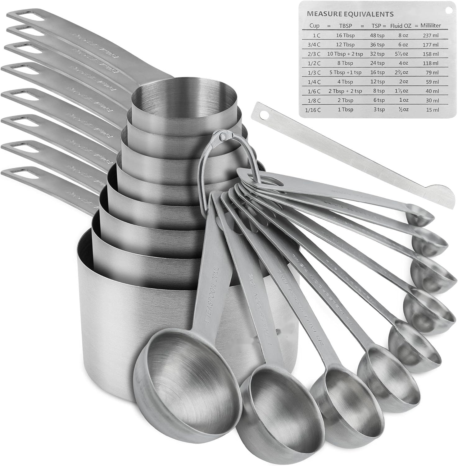 This measuring cups and spoons set makes your cooking life easier, more fun, and accurate. The 18/8 stainless steel construction ensures durability and resistance to corrosion.