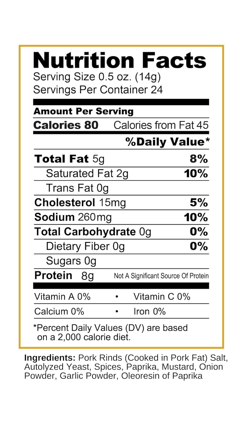 ✔️ WHY PORK RINDS? First and foremost, they’re Pork-King good! (See what we did there?!) We’ve developed the most insanely delicious pork rinds out there…Light, salty, crunchy melt-in-your-mouth whisps of deliciousness…need we say more? Pork King Good pork rinds are not just any old snack food. They’re the ultimate, naturally low-carb, quintessentially keto snack food! Each serving contains: – 0 grams of carbs – 0 grams of sugar – Only 90 calories!