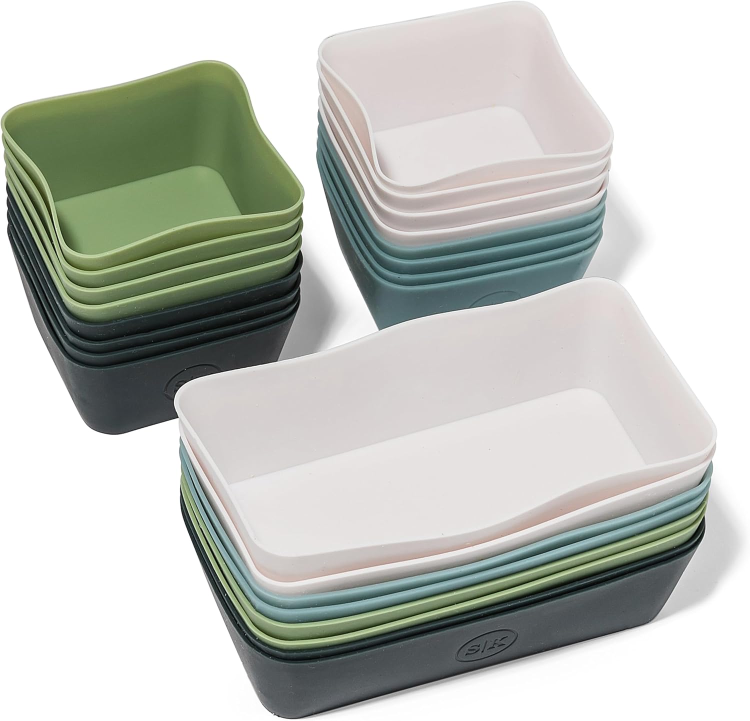 - 8 rectangle food-grade silicone bento cups in four beautiful colors: 2 Vintage Navy, 2 Dusty Blue, 2 Sage Green, and 2 Designer White